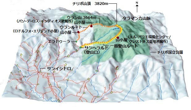 チリポ山頂へは、サンへラルドから出発する一般登山ルートと、エラドゥーラから出発するウランルートの2つあります。一般登山ルートは、登頂口から整備されたトレイルを辿って登頂し、帰路は同じ道を通り戻ってくるコースで、往復約40kmを2泊3日の行程で行います。ウランルートは、登頂口から、古来から先住民が使っていたタラマンカ山脈の頂き付近の道を辿ってチリポ山に登頂し、帰路は一般ルートを通って戻る周回コースになっています。往復約46.5kmを3泊4日で行うコースは、ローカル登山ガイドの同伴が義務付けられています。